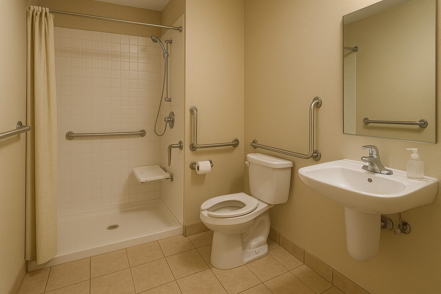 La habitación cuenta con cama articulada regulable en altura, baño adaptado con barras de sujeción y suelo antideslizante, sistemas de emergencia en la cama y el baño, buena iluminación natural, climatización y espacio libre suficiente para el desplazamiento seguro de los residentes. Todo está pensado para maximizar el confort, la autonomía y la seguridad.
