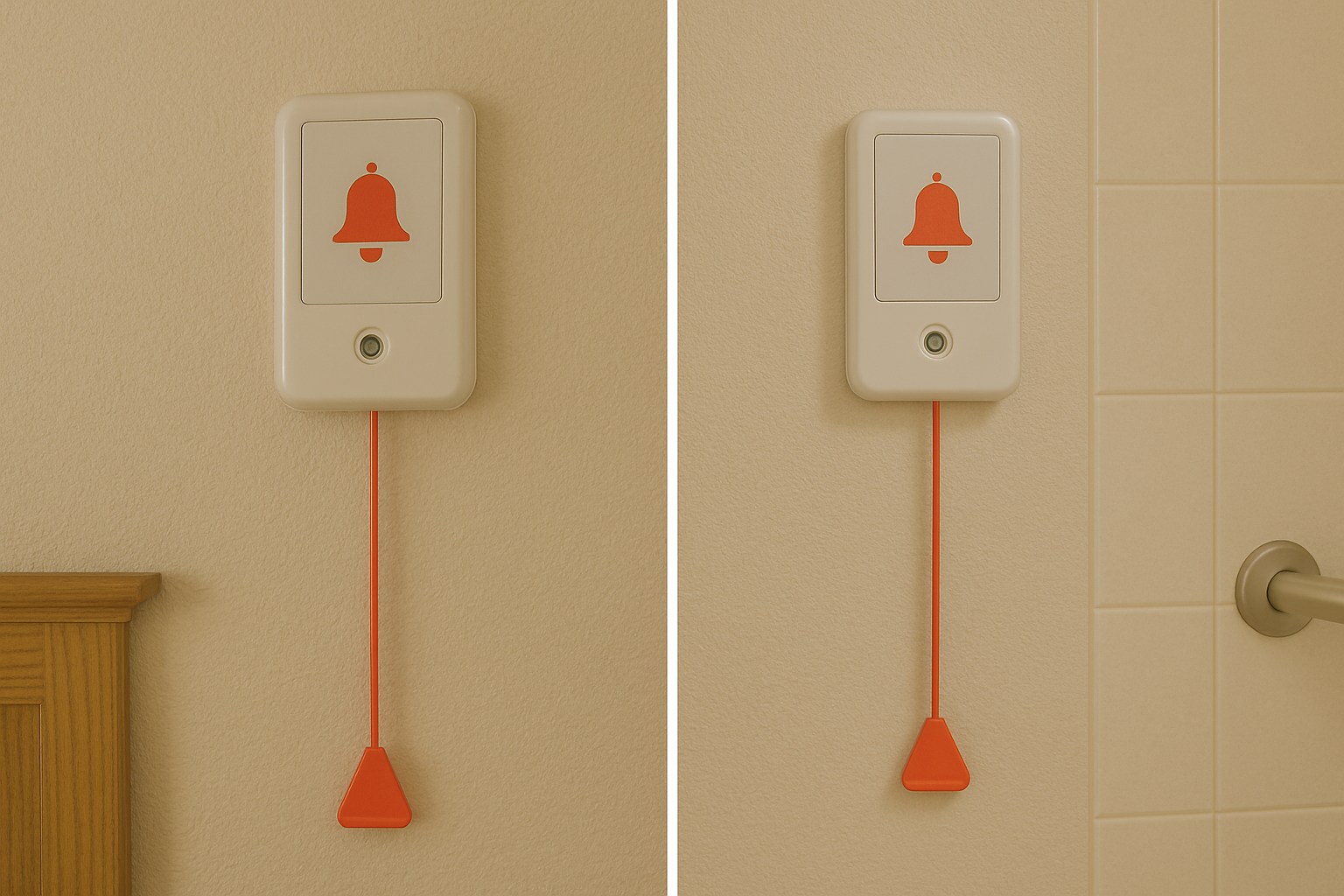 Botones de llamada en baño y cabecera de la cama para atención inmediata en caso de necesidad.